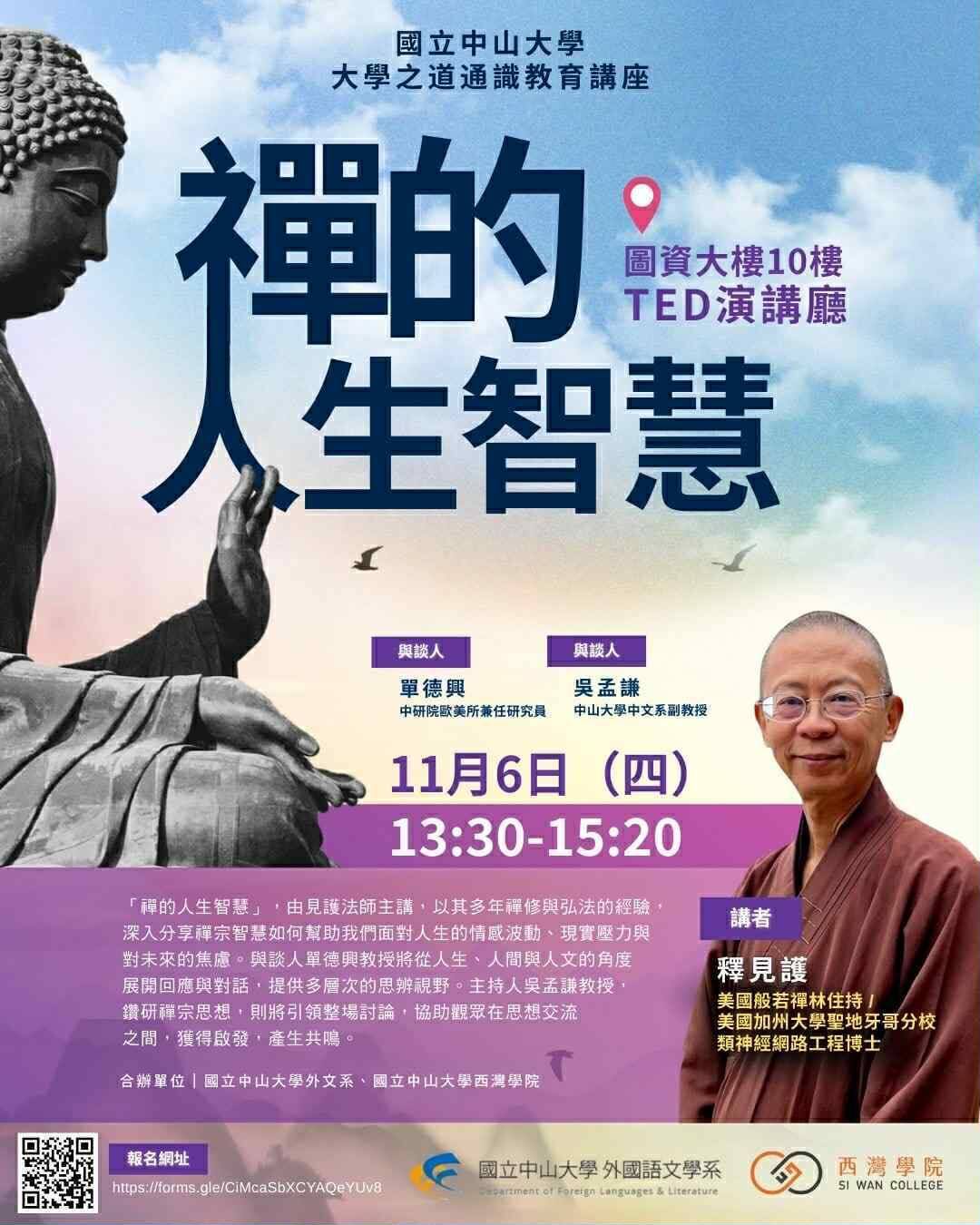 在現代社會的快速步調中,情感的牽絆、壓力的重負與未來的不確定,往往使人徘徊於焦慮與迷惘之間。如何在日常生 活的起伏中,仍能保持心境的清明與安穩,是我們共同面臨的課題。禪,作為東方思想與修行的重要傳統,不僅是一種宗 教體驗,更是一種生活智慧,引導人回到當下,體驗「如實」的存在,並透過覺察與省思,培養出穿透困境的洞見與能 量。 「禪的人生智慧」,由見護法師主講,以其多年禪修與弘法的經驗,深入分享禪宗智慧如何幫助我們面對人生的情感波 動、現實壓力與對未來的焦慮。與談人單德興教授將從人生、人間與人文的角度展開回應與對話,提供多層次的思辨視 野。主持人吳孟謙教授,鑽研禪宗思想,則將引領整場討論,協助觀眾在思想交流之間,獲得啟發,產生共鳴。這場講座 不僅是一個探討禪思的學術交流,更是一段關於人生態度的智慧對話。透過宗教與人文的交會,與會者將有機會重新思考 如何在繁忙與不安中,找到屬於自己的清明、自在與方向。