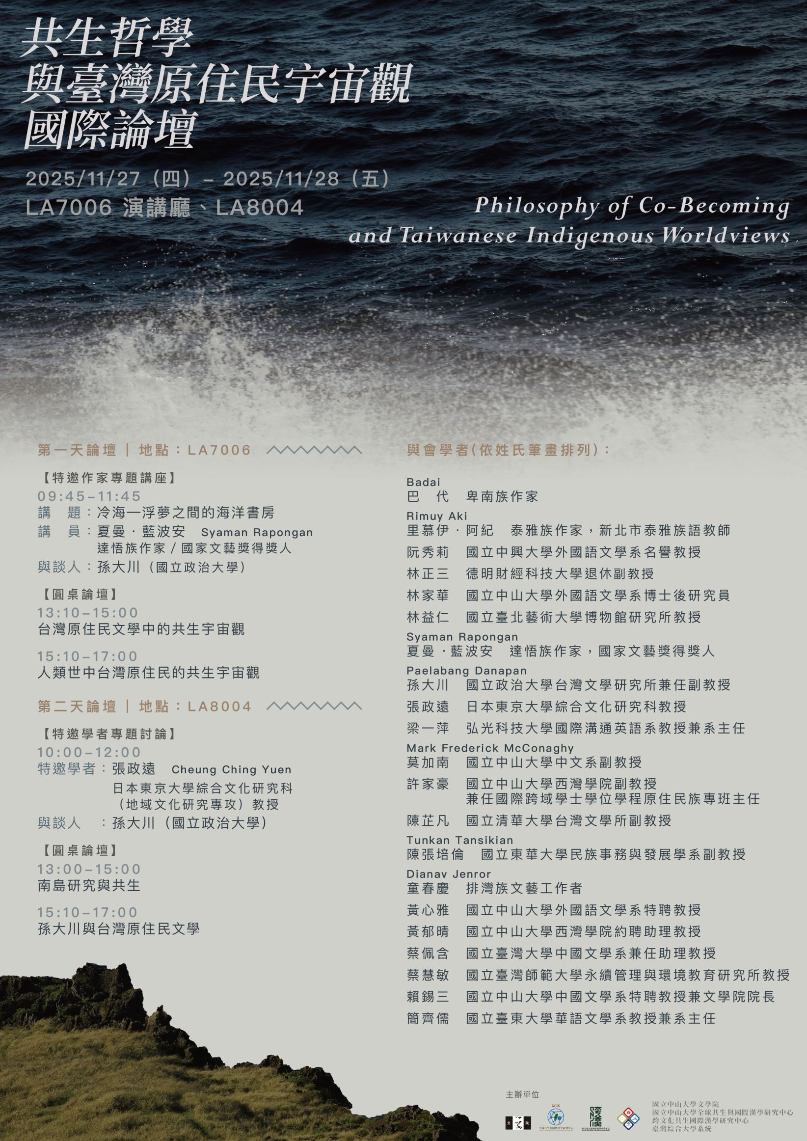 【共生哲學與臺灣原住民宇宙觀國際論壇】由國立中山大學文學院、國立中山大學全球共生與國際漢學中心、跨文化共生國際漢學研究中心、臺灣綜合大學系統聯合主辦。